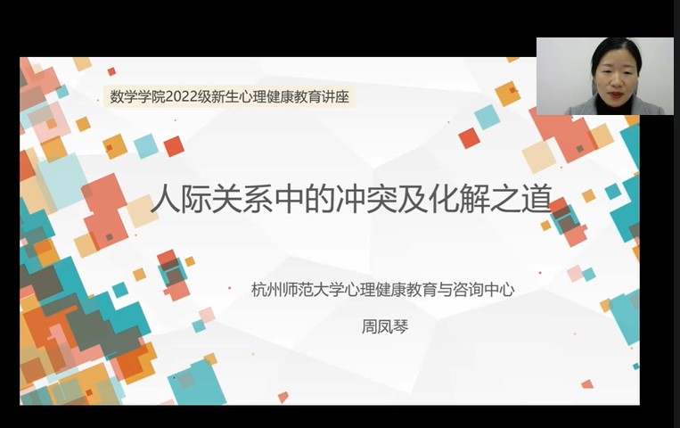 为扎实做好新生心理健康教育,帮助学生提高心理自助能力,能够以积极向上的精神面貌面对大学生活,12月7日下午,蜜桃视频 邀请国家二级心理咨询师、北京师范大学教育学硕士、东方明见“领鹰计划”督导师、专职心理咨询师周凤琴老师为大一新生带来心理健康教育讲座。讲座采取线上直播方式,2022级全体新生参加讲座。