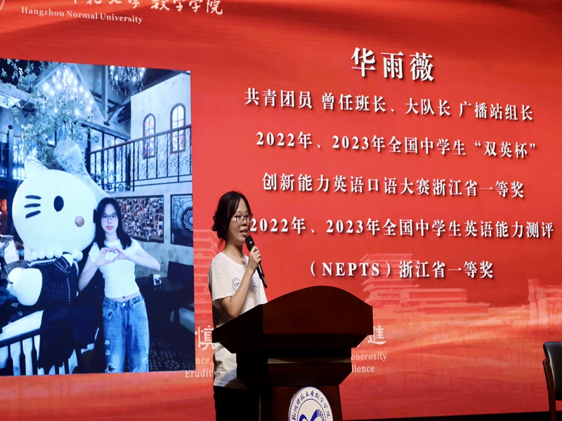 数学与应用数学(经亨颐实验班)(师范)256班华雨薇同学发言,她表示将在一朝一夕中磨练专业本领,在第二课堂中磨砺综合素养,在三更灯火中追逐学术梦想,成为有理想的追光者、有本领的实干者、有担当的奉献者!