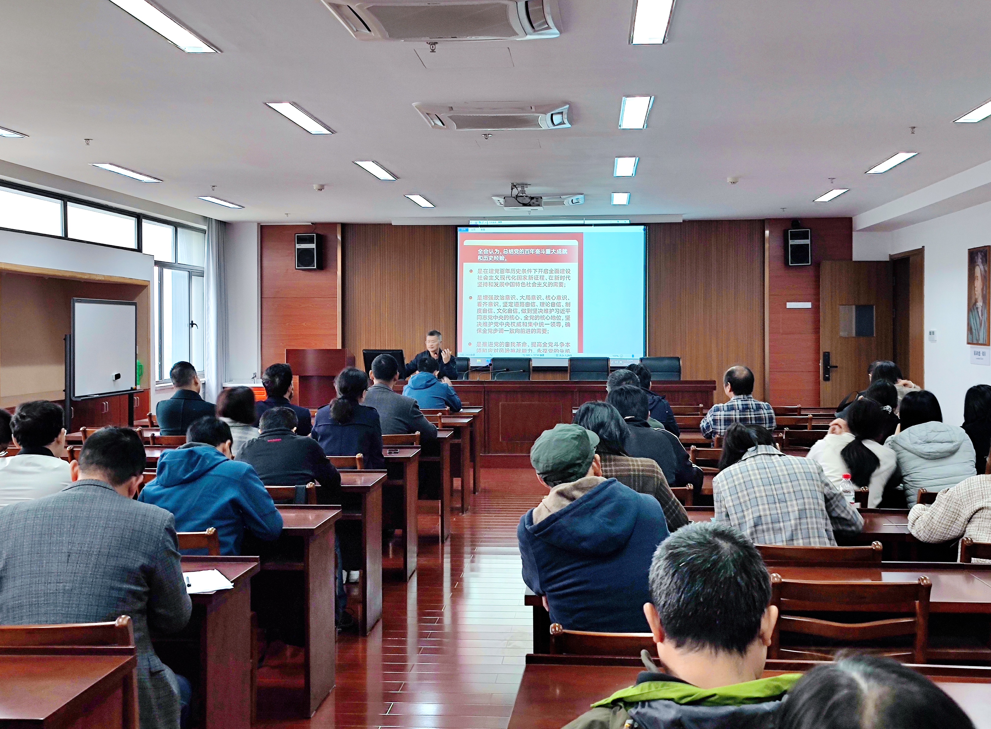 11月17日下午,学院召开全体党员大会,专题学习贯彻落实党的十九届六中全会精神,党委书记徐金芳主持会议,传达习近平总书记重要讲话精神,并就深入学习贯彻落实十九届六中全会精神讲话。全体在校院领导出席会议。