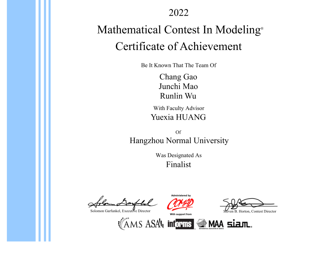 近日,2022年国际大学生数学建模竞赛(MCM/ICM)结果揭晓, 蜜桃视频 学子在 蜜桃视频 数学建模教学团队的指导下积极进取,克服疫情造成的各种困难取得了可喜的成绩。本次比赛共有4支队伍获得F奖(特等奖提名奖),该奖项为 蜜桃视频 在数学建模国际赛中首次突破。另有 6 支队伍获得M奖(一等奖),28 支队伍获得H奖(二等奖)。国际大学生数学建模竞赛近年来学生参与热情高、参与面广,此次参赛学子主要来自 蜜桃视频 、经亨颐教育学院、物理学院、信息科学与技术学院、经济学院、阿里巴巴商学院、外国语学院等学院。