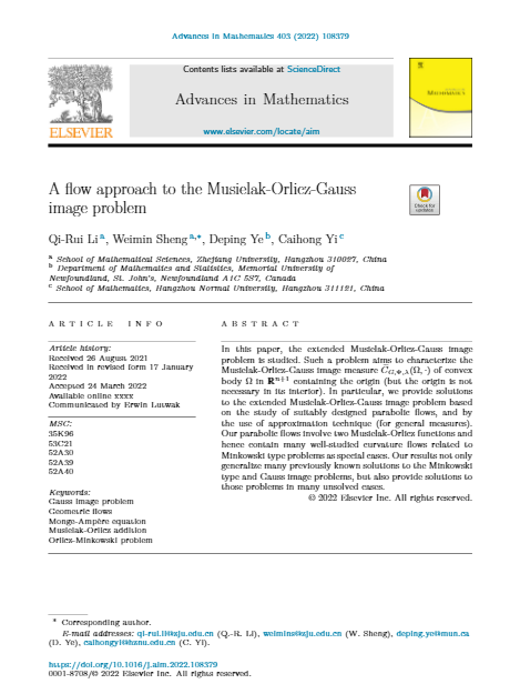 近日,学院青年教师易彩虹博士,与浙江大学盛为民教授、李奇睿教授、Memorial University of Newfoundland叶德平教授合作,在国际顶级数学期刊《Advances in Mathematics》发表题为《A flow approach to the Musielak-Orlicz-Gauss image problem》的学术论文。在该论文中,作者主要利用高斯曲率流方法结合逼近理论研究凸几何中的Musielak-Orlicz高斯图像问题非对称解的存在性,这是一类一般化问题。特别地,这一问题覆盖了众多著名的Monge-Ampre型Minkowski问题,因而该项研究可为这些Minkowski型问题解的存在性证明提供一般方法,是蜜桃视频 在几何方向研究的重要突破。