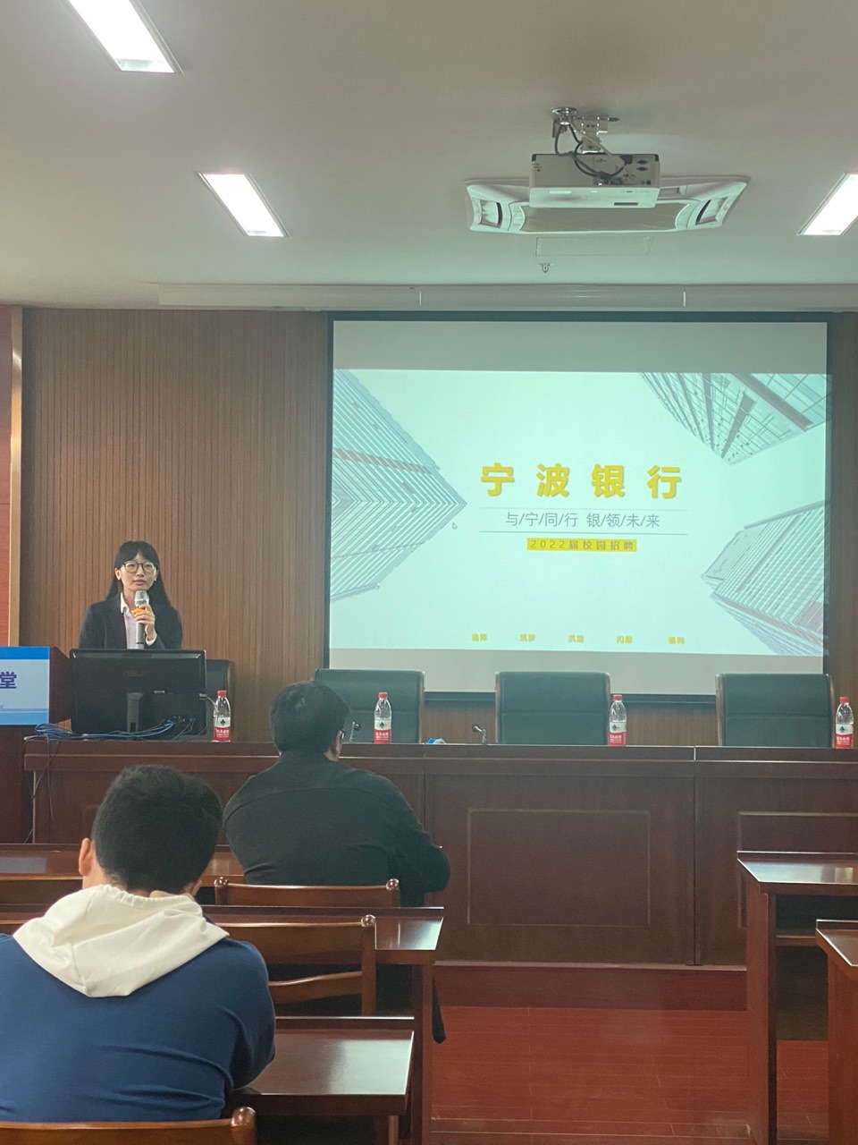 来自宁波银行的裘艺南经理从职业生涯规划的角度出发,为同学们梳理了大学生求职过程中应注意的问题。她从发展历程、产业布局、组织框架、分布区域以及所得收益等几个方面全面介绍了宁波银行。接着,她着重介绍了校园招聘相关事项,包括招聘要求、“一体两翼”的培训管理体系、晋升体系、蜜桃视频、人文关怀等。来自宁波银行的张小碟经理,为同学们分享了大学期间的学习经历、求职历程和职业发展过程,并希望同学们能从实习做起,把握好机会,争取在一个优秀的团队中有所收获。