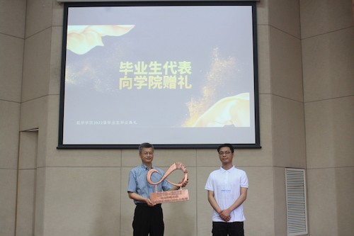 毕业生代表数学183沈慕华同学、数科181吕康滔同学向学院赠送毕业纪念品。这是一个“无穷大”的数学符号。寄语母院创造无穷大的可能,培养无穷多的数学学子,希望从美丽的湿地书院走出更多优秀数学家,也真诚地祝愿母院的老师们幸福无穷多、烦恼无穷少,论文无穷多、拒稿无穷少。这也是一个“8字形”的青春赛道。借这个机会,在母院的见证下,向自己许下一个青春诺言,从今天起,无论是从事数学研究、数学教育还是数学应用,都将用自己无穷大的力量,在青春赛道上奋力奔跑,跑出2022届杭师大数学人最好的接力棒!