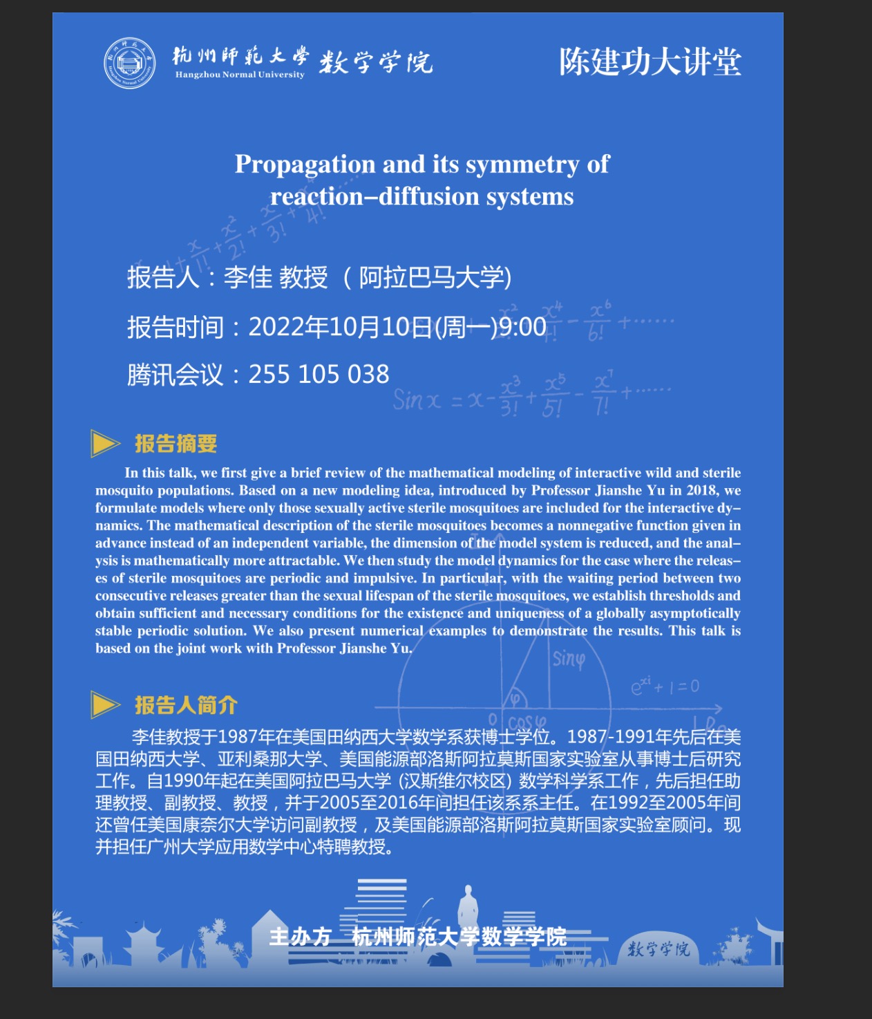 陈建功大讲堂:Mathematical Modeling of Interactive Wild and Sterile Mosquitoes with Periodic and Impulsive releases