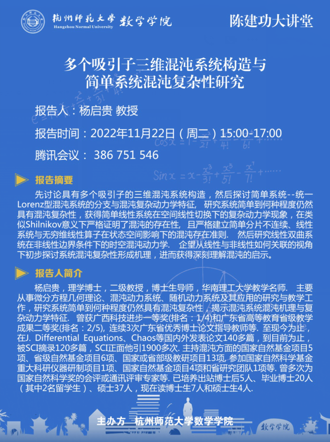 陈建功大讲堂:多个吸引子三维混沌系统构造与简单系统混沌复杂性研究