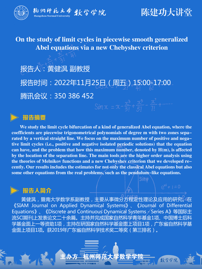 陈建功大讲堂:On the study of limit cycles in piecewise smooth generalized Abel equations via a new Chebyshev criterion