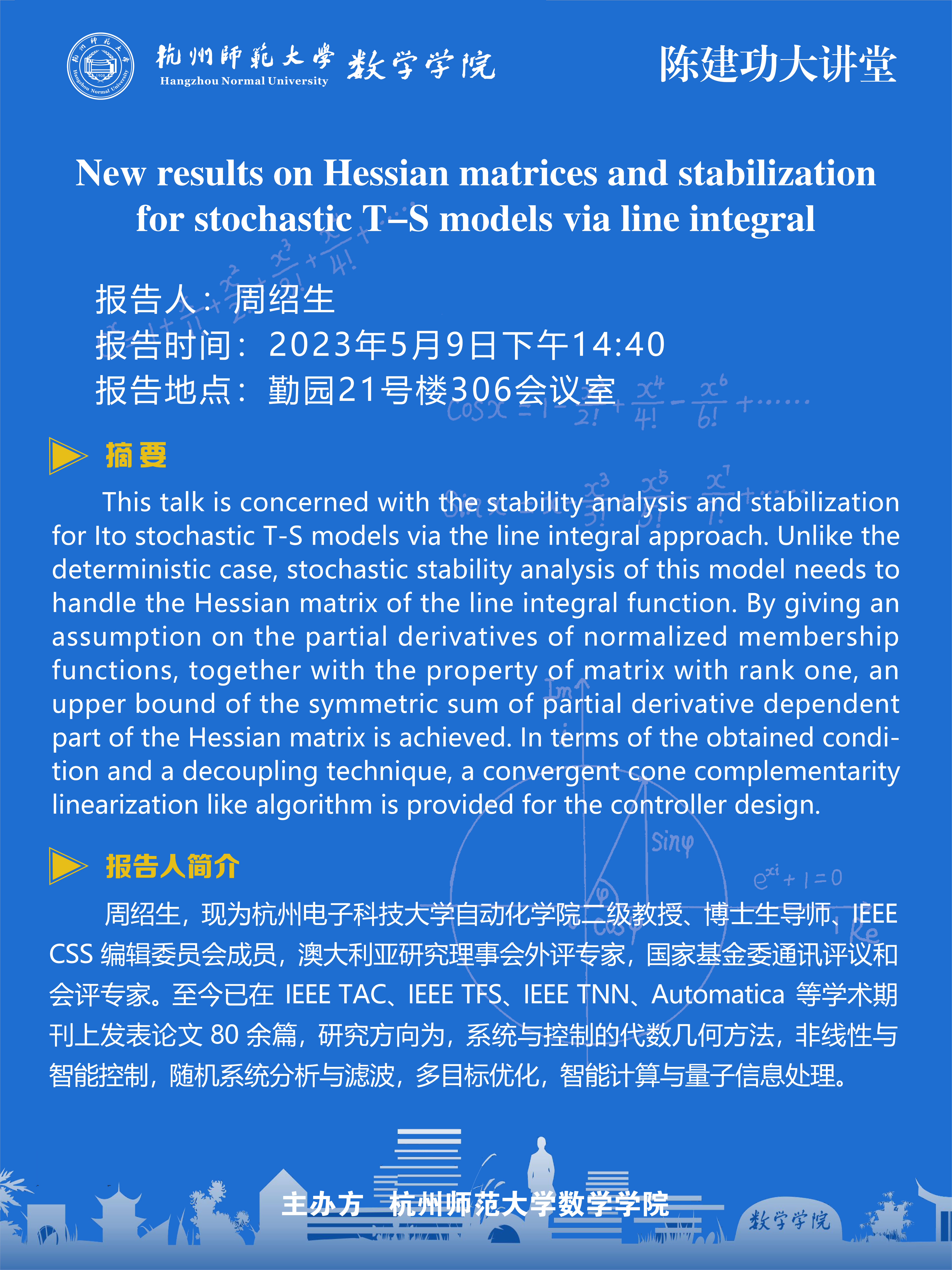 陈建功大讲堂:New results on Hessian matrices and stabilization for stochastic T-S models via line integral