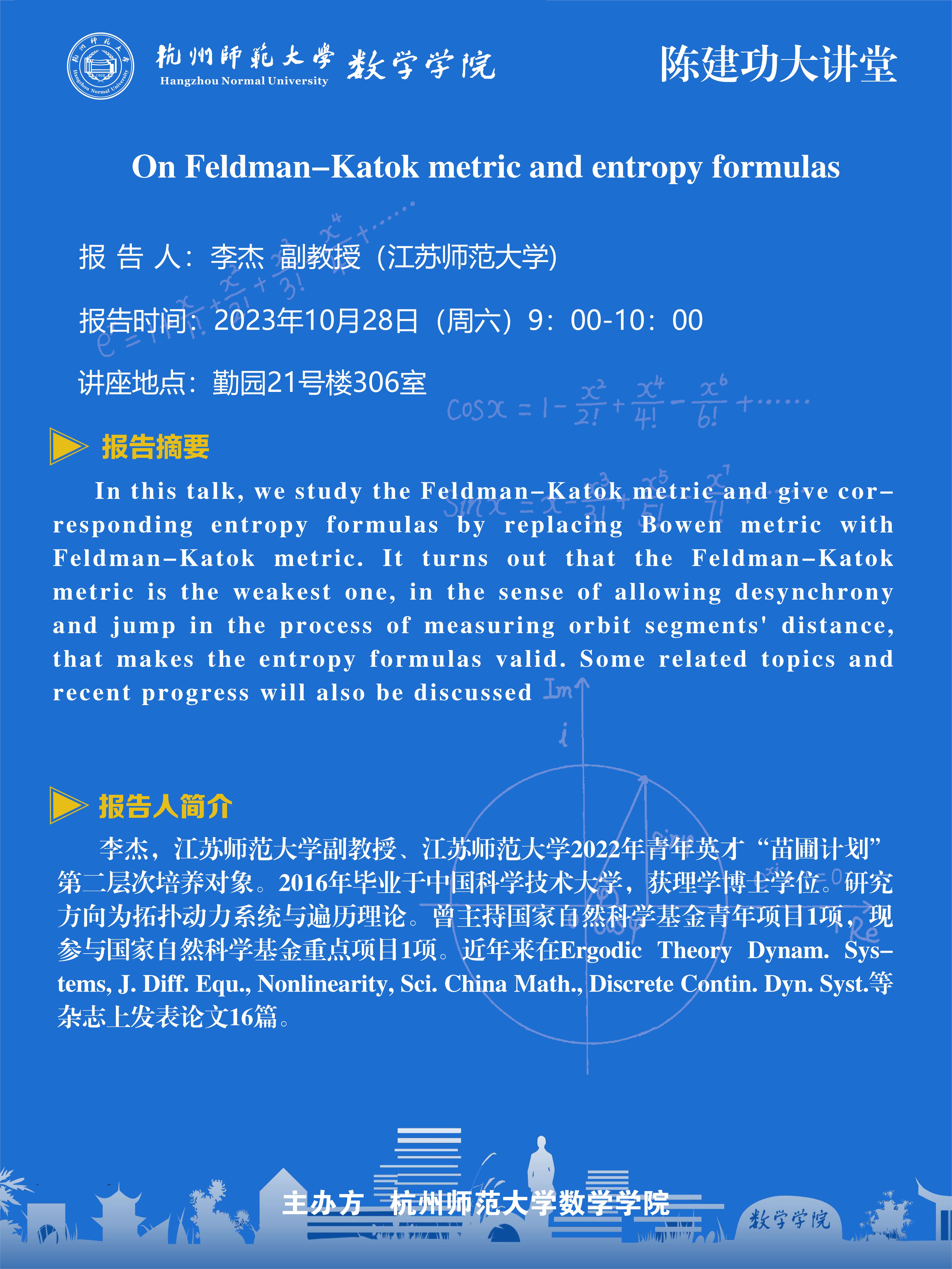 陈建功大讲堂:On Feldman-Katok metric and entropy formulas