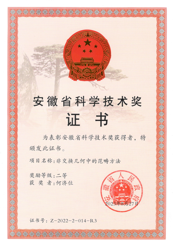 近日,安徽省科学技术厅公布了2022年度安徽省科学技术奖专业(学科)评审结果。蜜桃视频 何济位教授参与的项目“非交换几何中的范畴方法”获二等奖。本项目隶属代数学领域,主要研究非交换几何领域若干重要代数类的环论性质、同调性质和表示理论,如Poisson代数、Hopf代数作用的不变子代数、PI代数等,是代数学、代数几何、数学物理等领域共同关注的重要研究领域。