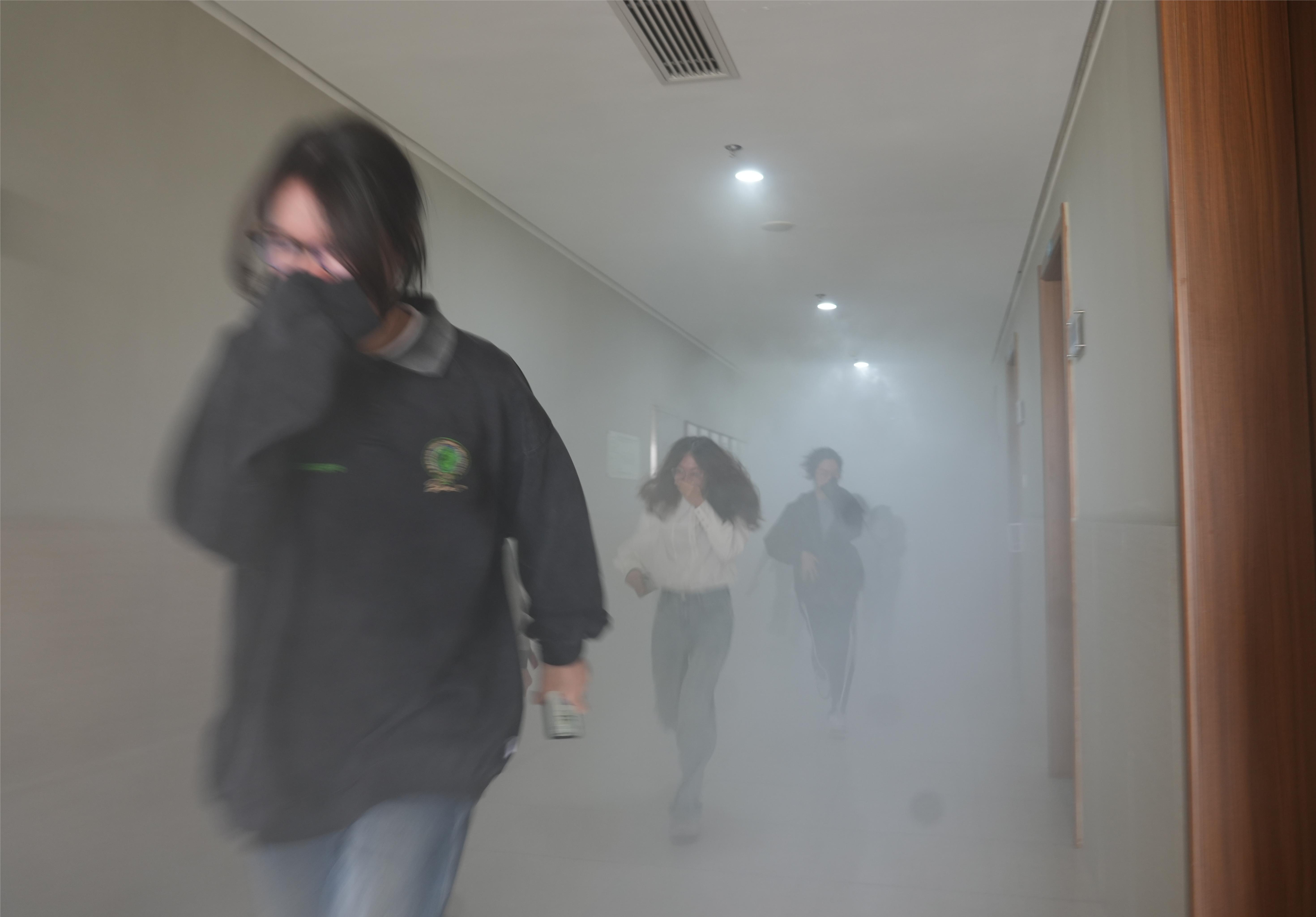 警报响起,师生们猫腰捂鼻有序逃离火灾现场