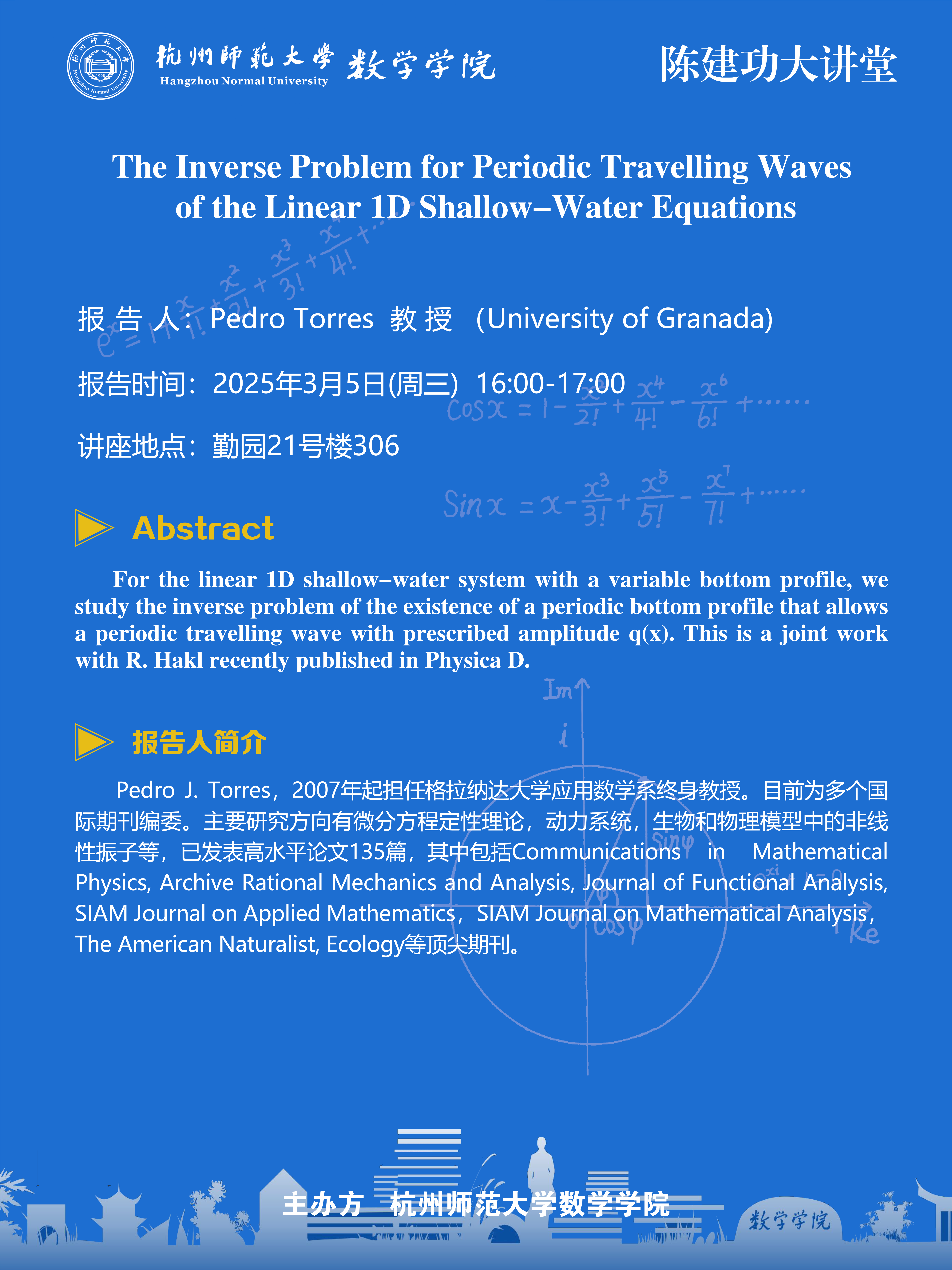 陈建功大讲堂(2025-9):The Inverse Problem for Periodic Travelling Waves of the Linear 1D Shallow-Water Equations