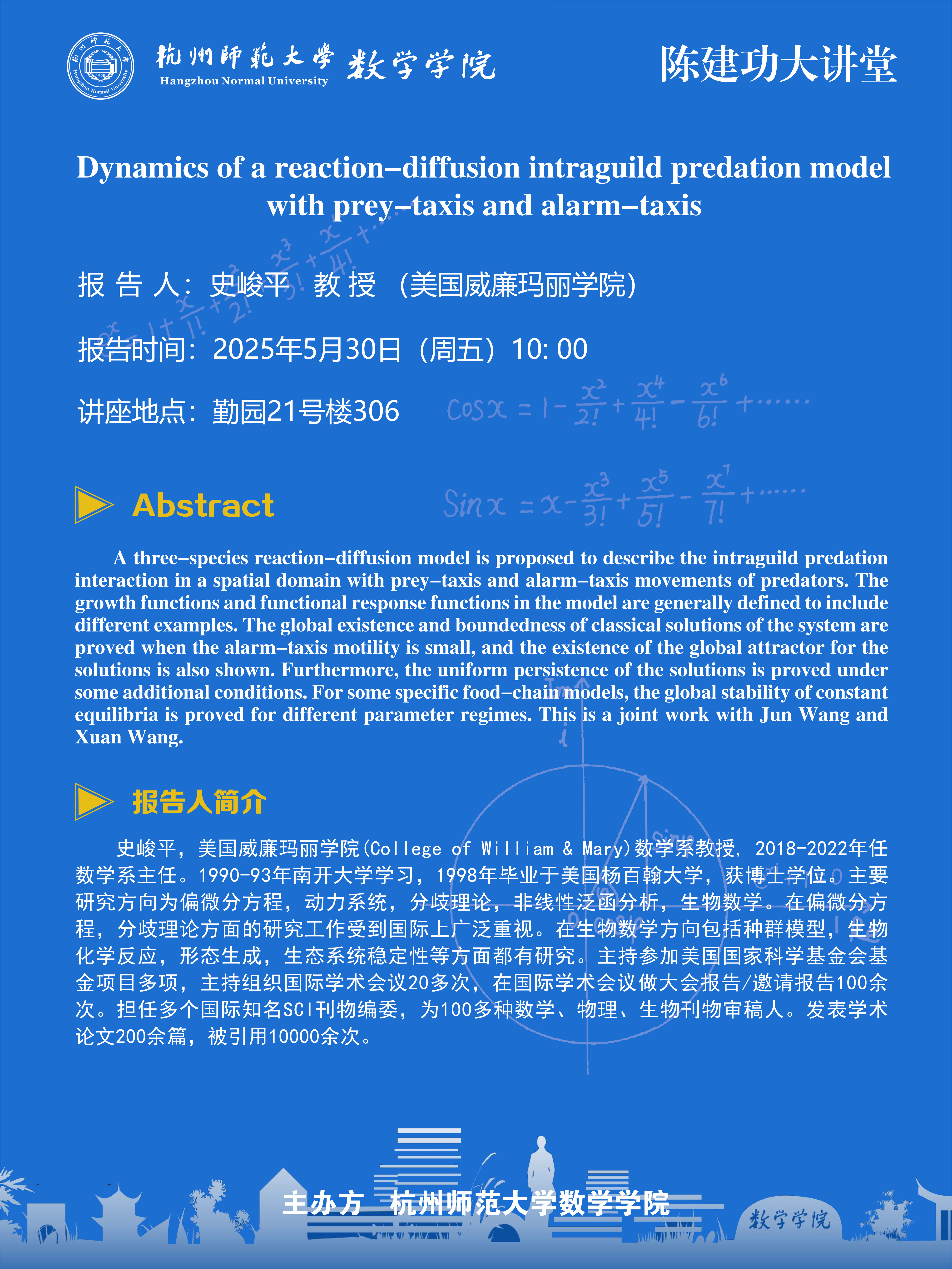 陈建功大讲堂(2025-44):Dynamics of a reaction-diffusion intraguild predation model with prey-taxis and alarm-taxis
