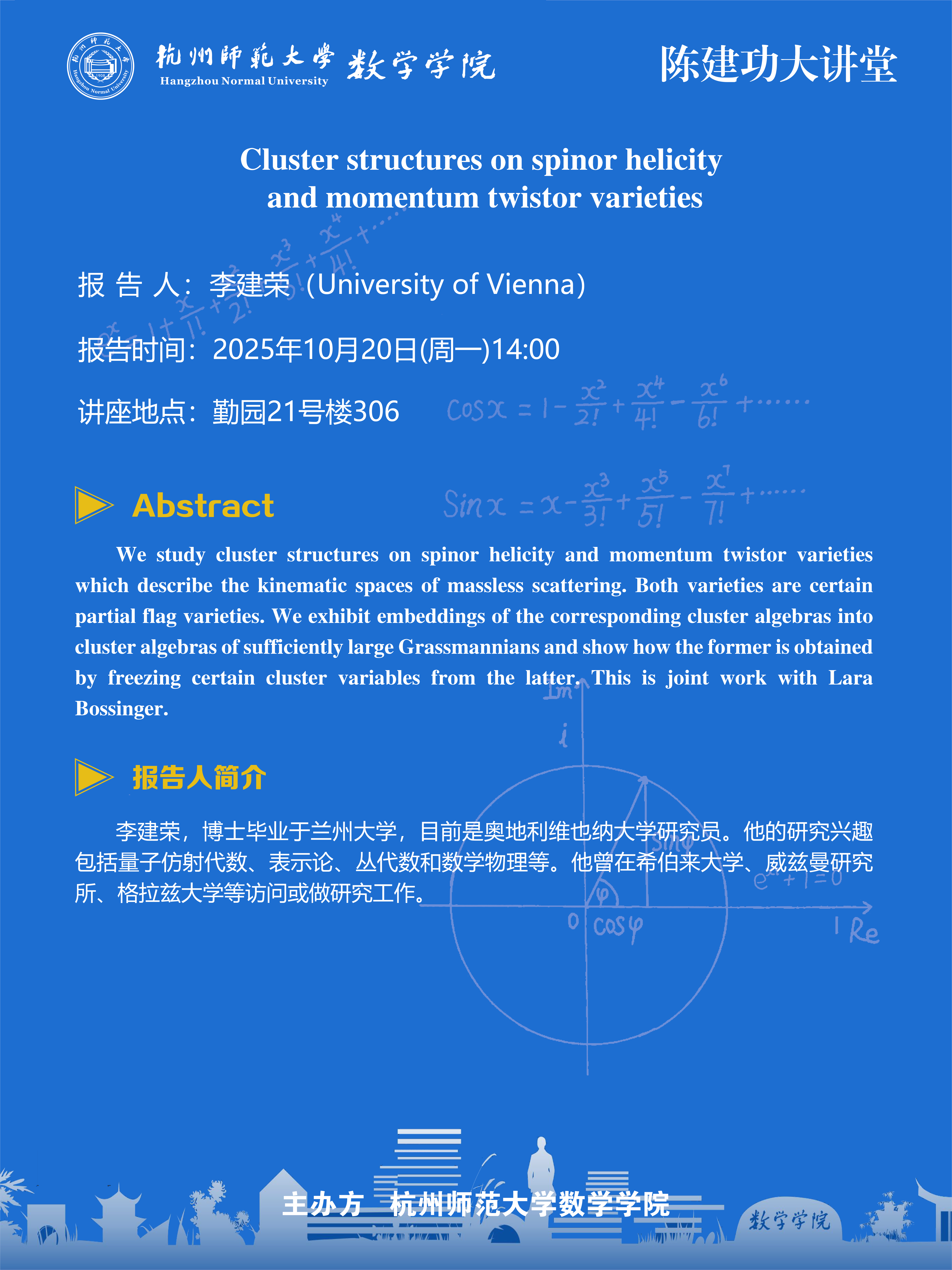 陈建功大讲堂(2025-90):Cluster structures on spinor helicity and momentum twistor varieties