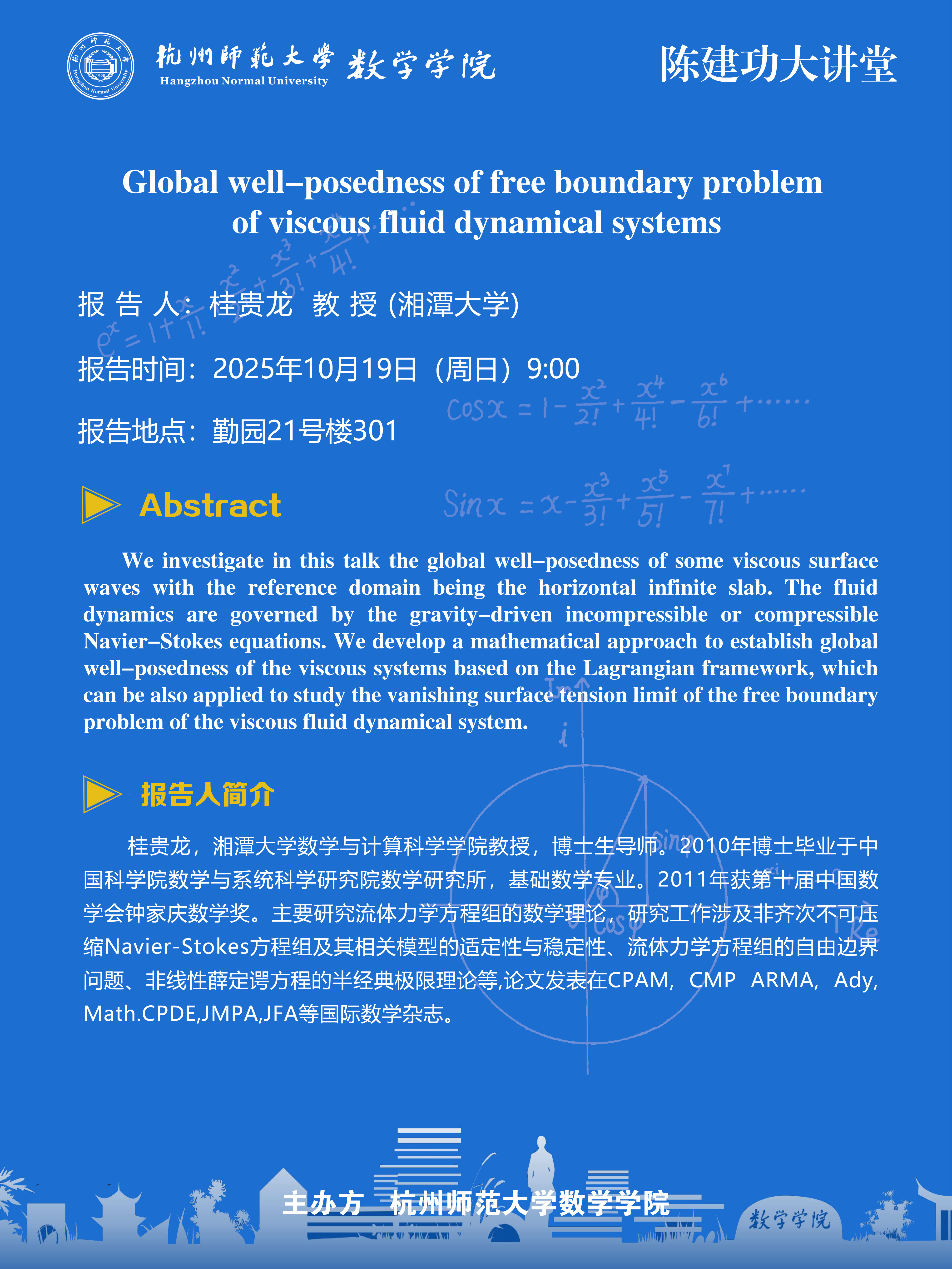 陈建功大讲堂(2025-92):Global well-posedness of free boundary problem of viscous fluid dynamical systems