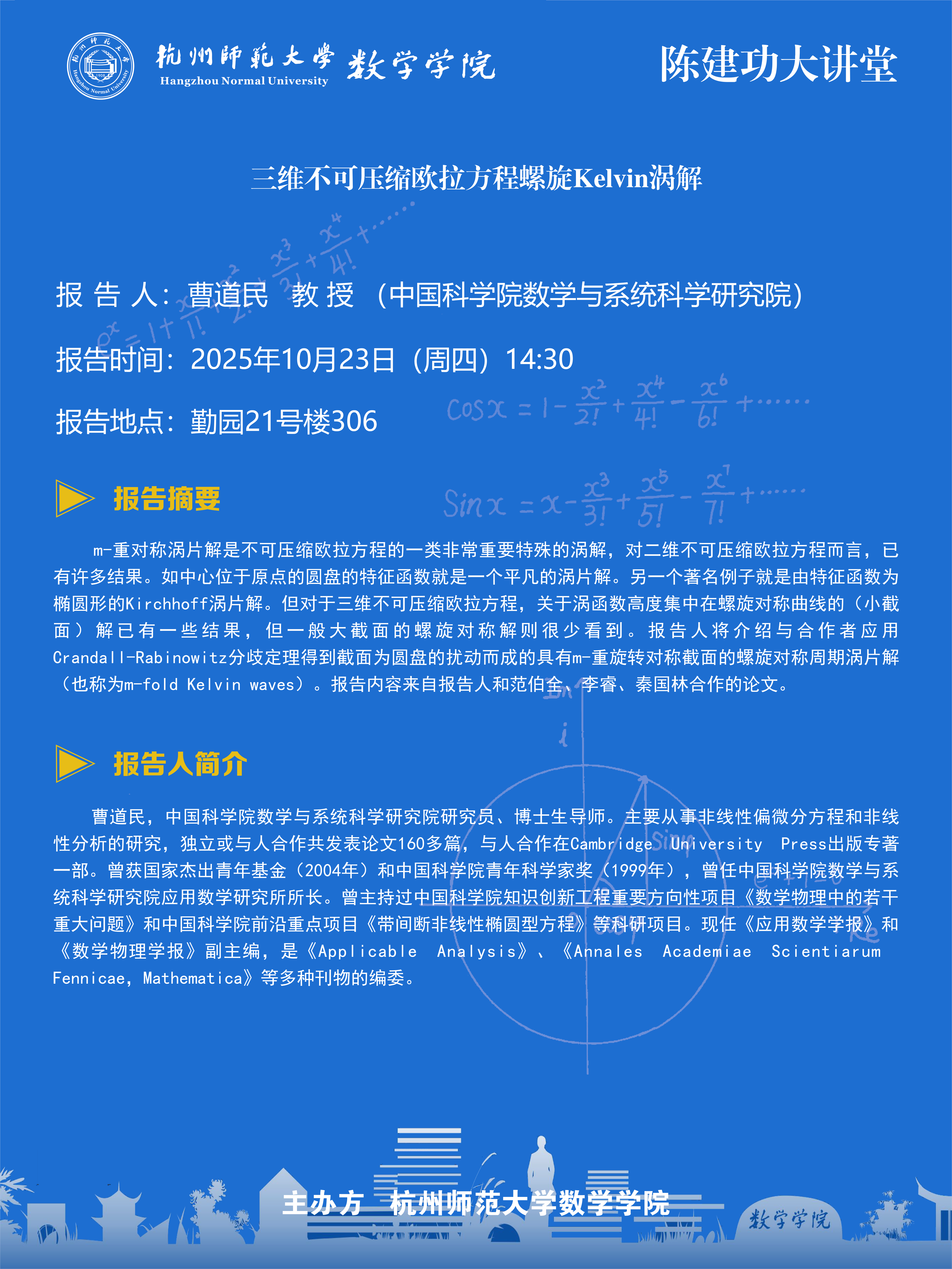 陈建功大讲堂(2025-94):三维不可压缩欧拉方程螺旋Kelvin涡解