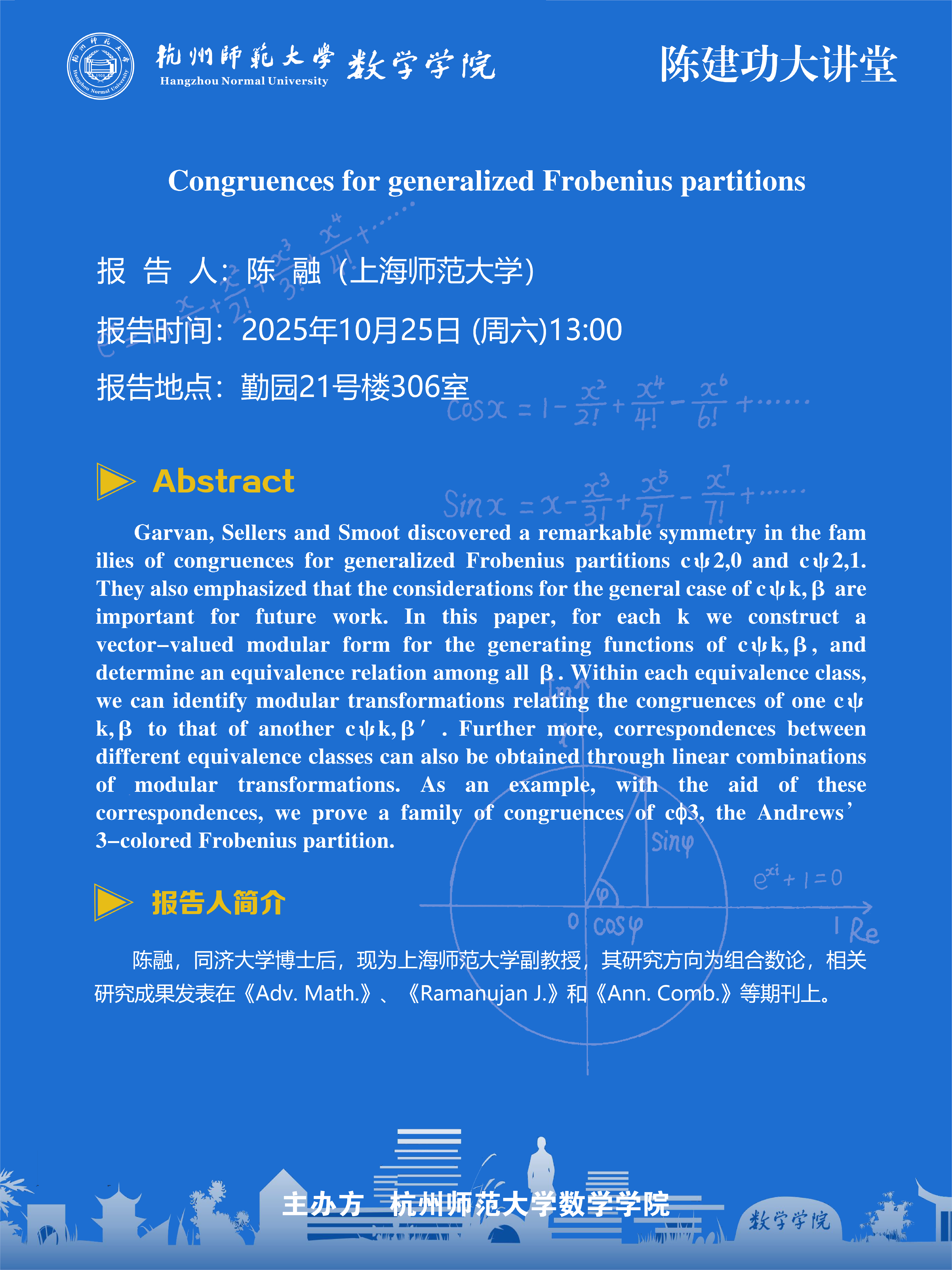 陈建功大讲堂(2025-106):Congruences for generalized Frobenius partitions