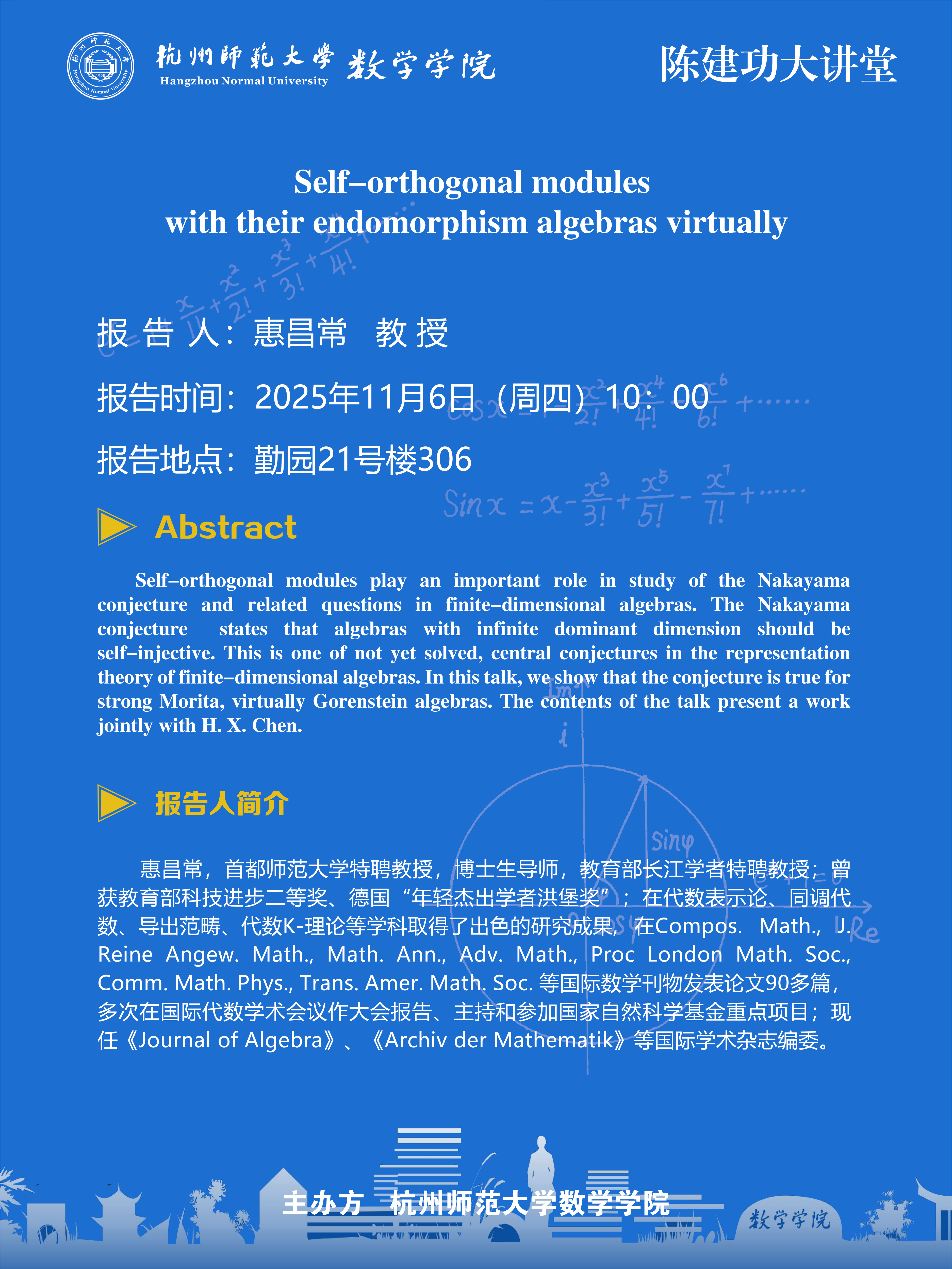 陈建功大讲堂(2025-116):Self-orthogonal modules with their endomorphism algebras virtually