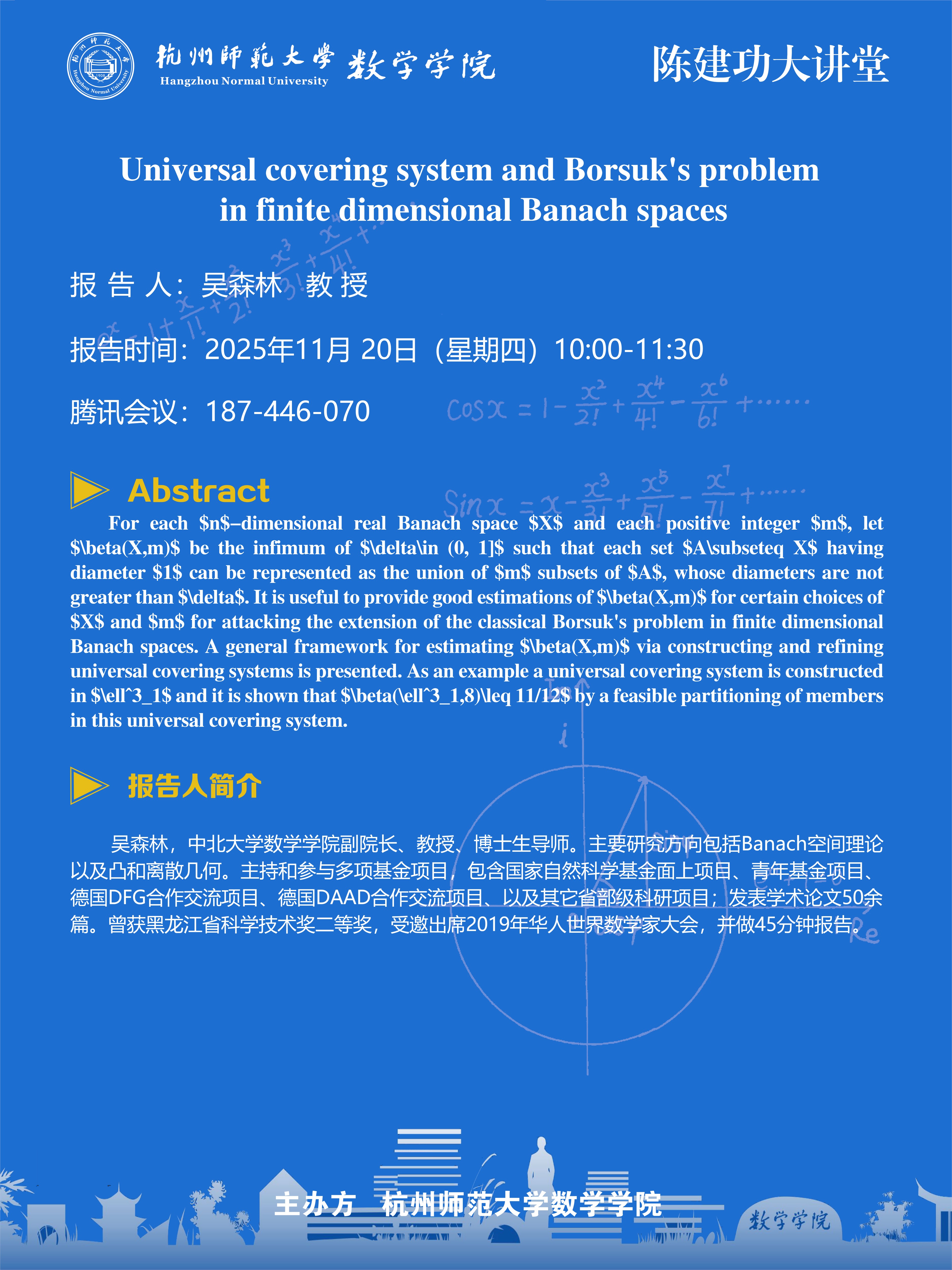 陈建功大讲堂(2025-136):Universal covering system and Borsuk's problem in finite dimensional Banach spaces