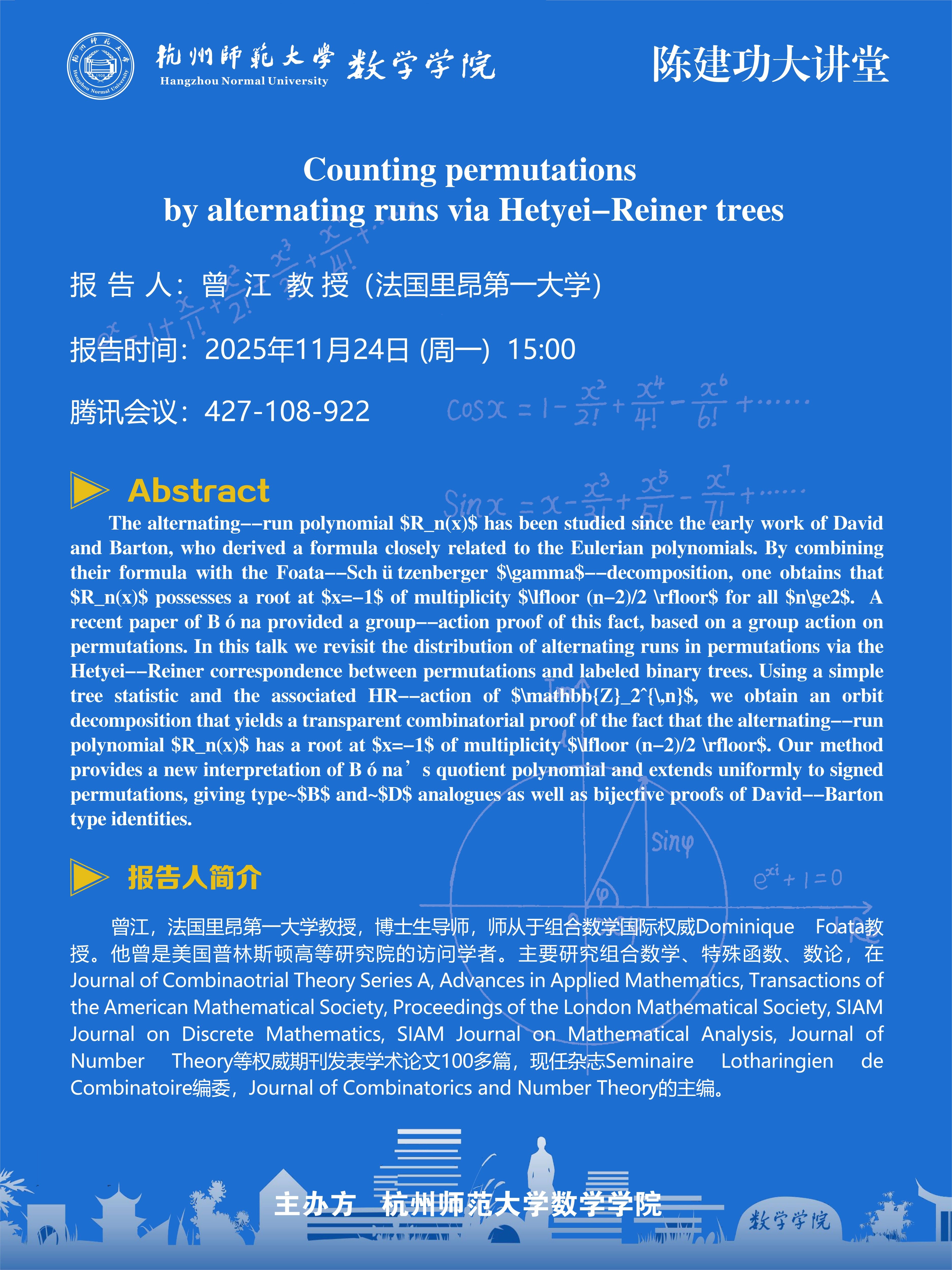 陈建功大讲堂(2025-137):Counting permutations by alternating runs via Hetyei-Reiner trees