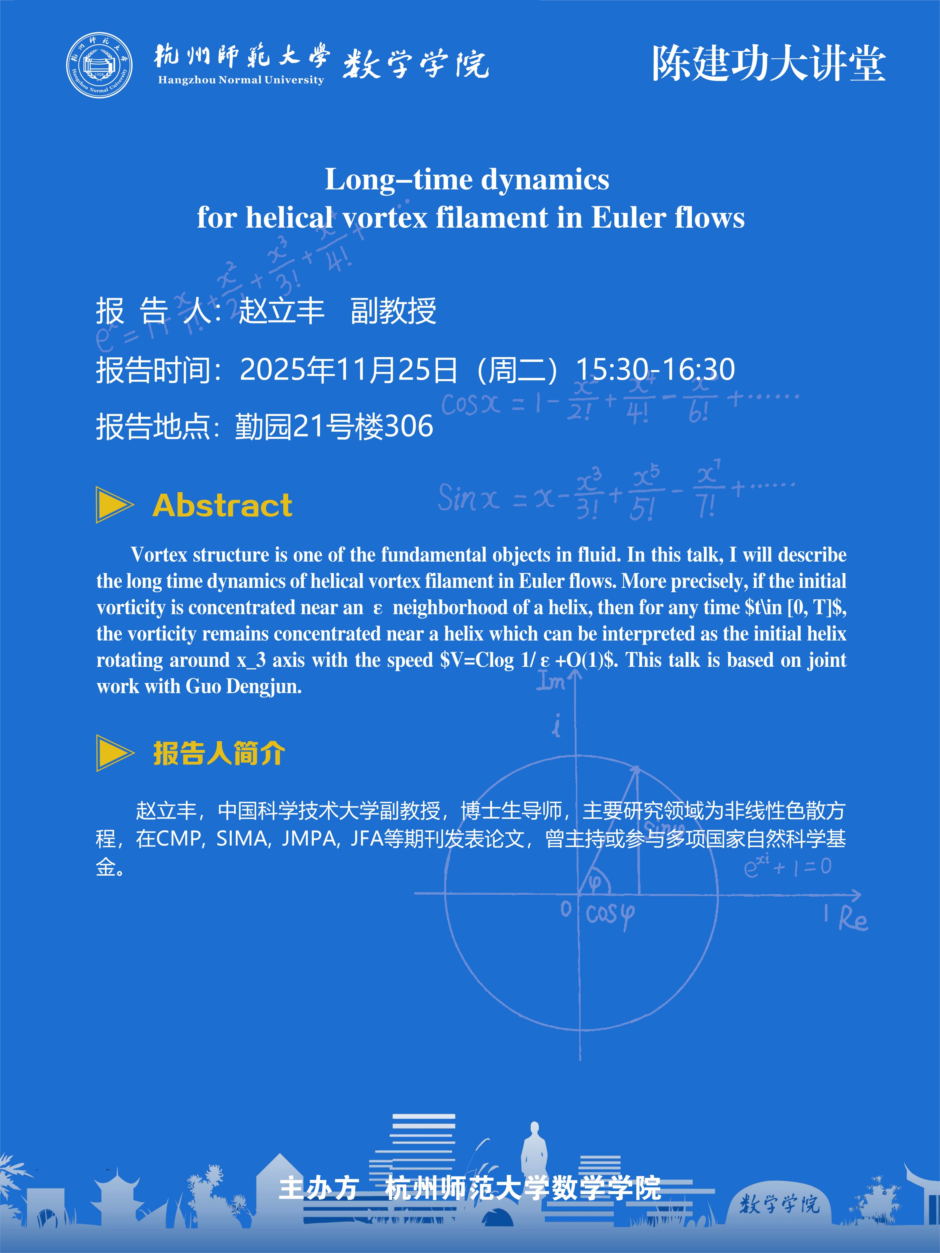 陈建功大讲堂(2025-140):Long-time dynamics for helical vortex filament in Euler flows